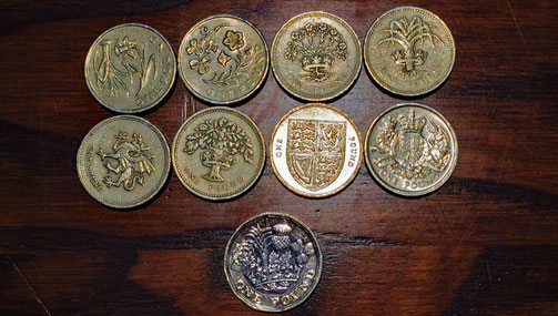 英国の1ポンド硬貨をよく見ると、各国の特性を刻印のデザインに盛り込んだものが多いことに気づきます。例えば私の手元にある1ポンド硬貨(ページ上の写真、上2列)にある王室紋章は英国 (United Kingdom)、水仙、リーク(ポロネギ)、ドラゴンはウェールズ、樫の木はイングランド、カタバミ、亜麻の花 は北アイルランドを象徴しています。また手元にはありませんでしたが、スコットランドを表すライオンやアザミを刻印したものもあります。