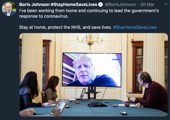 先週新型コロナウイルス陽性が判明し、自宅療養中のボリス・ジョンソン首相ですが、政府担当者とビデオ会議をしている様子をツイッターに掲載しています。