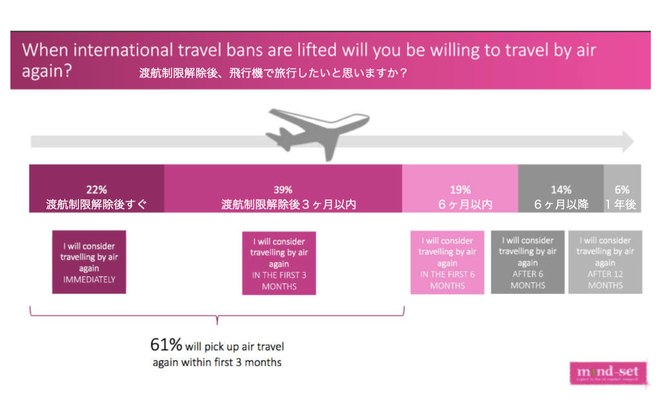 「渡航制限が解除されたら、飛行機で旅行したいと思うか?」の問いに対し、約6割が「制限解除後3ヶ月以内にしたい」と答えました。(写真・日本語は弊社が追加)