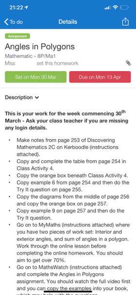 9割以上の科目の宿題はもともとオンライン。Show my homeworkというアプリを使い、宿題やテストの内容など全てこのアプリで連絡。親も宿題の内容や進捗を確認できます。(写真は数学の宿題)。