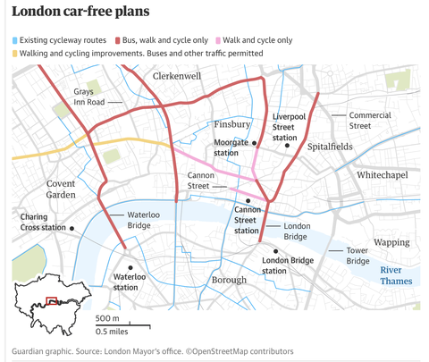 これを受けロンドン市は、一部道路を自転車・歩行者専用道路にする計画を発表しました。それによれば、ロンドン郊外から中心部への自転車専用道路も整備される予定です。(写真:ロンドン中心部の計画。The Guardianより)