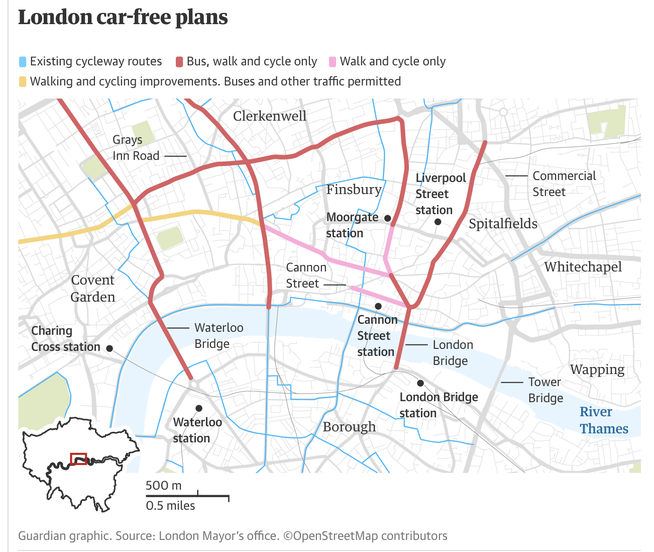 これを受けロンドン市は、一部道路を自転車・歩行者専用道路にする計画を発表しました。それによれば、ロンドン郊外から中心部への自転車専用道路も整備される予定です。(写真:ロンドン中心部の計画。The Guardianより)