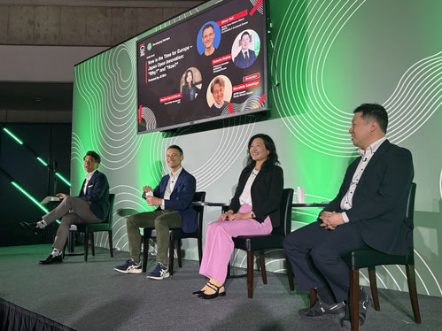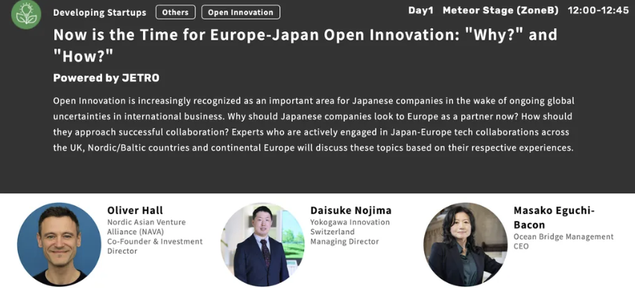 SusHi Tech Tokyo 2025におけるJETROのパネルセッション。野島大佑氏(横河イノベーションスイス)、オリバー・ホール氏(ノルディック・アジアン・ベンチャー・アライアンス)、江口・ベイコン昌子(オーシャンブリッジ・マネジメント)が欧州・日本のオープンイノベーションについて議論を交わしました。モデレーターはジェトロ・ロンドン事務所 次長 崎重雅英氏が務めました。