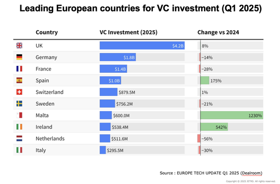 欧州において、英国はベンチャーキャピタルリーダーとしての地位を堅持しています。Dealroom社の「Europe Tech Update 2025年第1四半期版」の最新データは、英国の優位性を明確に示しています。