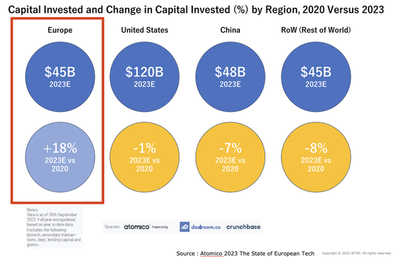 日本企業が欧州とのパートナーシップを検討すべき理由の一つとして、この地域における資本投資の驚くべき回復力と成長が挙げられます。Atomico社の「State of European Tech」レポートの最新データによると、2023年と2020年を比較した場合、欧州は資本投資額でプラス成長を示している唯一の主要な地域となっています。